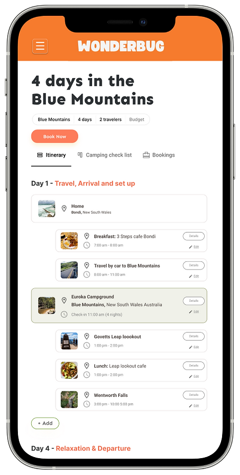 Wonderbugs' Smart itinerary will whip up tailored campsite recommendations, must-see spots, and awesome activities just for YOU. Your itinerary will include handy packing lists, travel tips, and all you need to make planning a breeze.